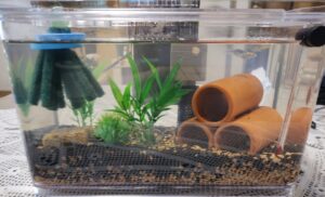 最初は、小さな水槽に、土や、人口水草に土管などちょっとした遊び心を盛り込んで、